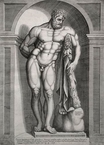 Bos was born in ‘s-Hertogenbosch in the southern Netherlands (in French, the city’s name is “Bois-le-Duc”), and was active in Rome from 1549 onward. His works, such as this one, were influenced by Marcantonio Raimondi (near Bologna 1480 – died between 1527 and 1534).